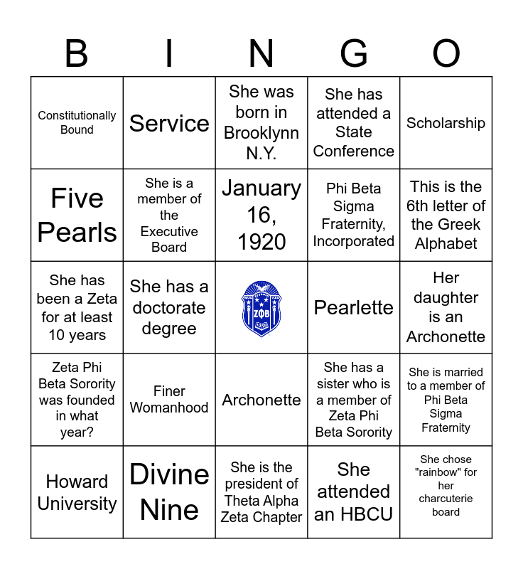 This bingo card has a free space and 24 words: Finer Womanhood, Divine Nine, January 16, 1920, Howard University, Scholarship, Constitutionally Bound, Five Pearls, Service, Pearlette, Archonette, Phi Beta Sigma Fraternity, Incorporated, She has been a Zeta for at least 10 years, She has a sister who is a member of Zeta Phi Beta Sorority, She is married to a member of Phi Beta Sigma Fraternity, She is a member of the Executive Board, She attended an HBCU, Her daughter is an Archonette, She was born in Brooklynn N.Y., This is the 6th letter of the Greek Alphabet, She has a doctorate degree, She chose "rainbow" for her charcuterie board, Zeta Phi Beta Sorority was founded in what year?, She has attended a State Conference and She is the president of Theta Alpha Zeta Chapter.