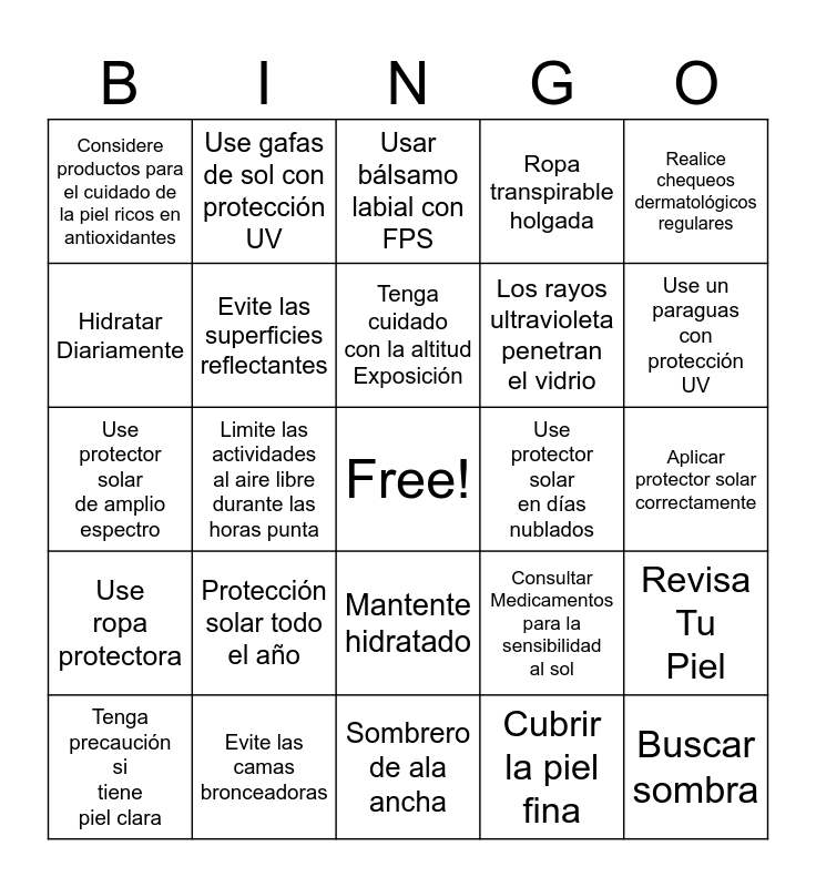This bingo card has a free space and 24 words: Protección solar todo el año, Evite las camas bronceadoras, Tenga cuidado con la altitud Exposición, Tenga precaución si tiene piel clara, Realice chequeos dermatológicos regulares, Considere productos para el cuidado de la piel ricos en antioxidantes, Hidratar Diariamente, Use gafas de sol con protección UV, Use protector solar en días nublados, Mantente hidratado, Los rayos ultravioleta penetran el vidrio, Use protector solar de amplio espectro, Consultar Medicamentos para la sensibilidad al sol, Revisa Tu Piel, Evite las superficies reflectantes, Cubrir la piel fina, Aplicar protector solar correctamente, Usar bálsamo labial con FPS, Use un paraguas con protección UV, Limite las actividades al aire libre durante las horas punta, Buscar sombra, Use ropa protectora, Ropa transpirable holgada and Sombrero de ala ancha.
