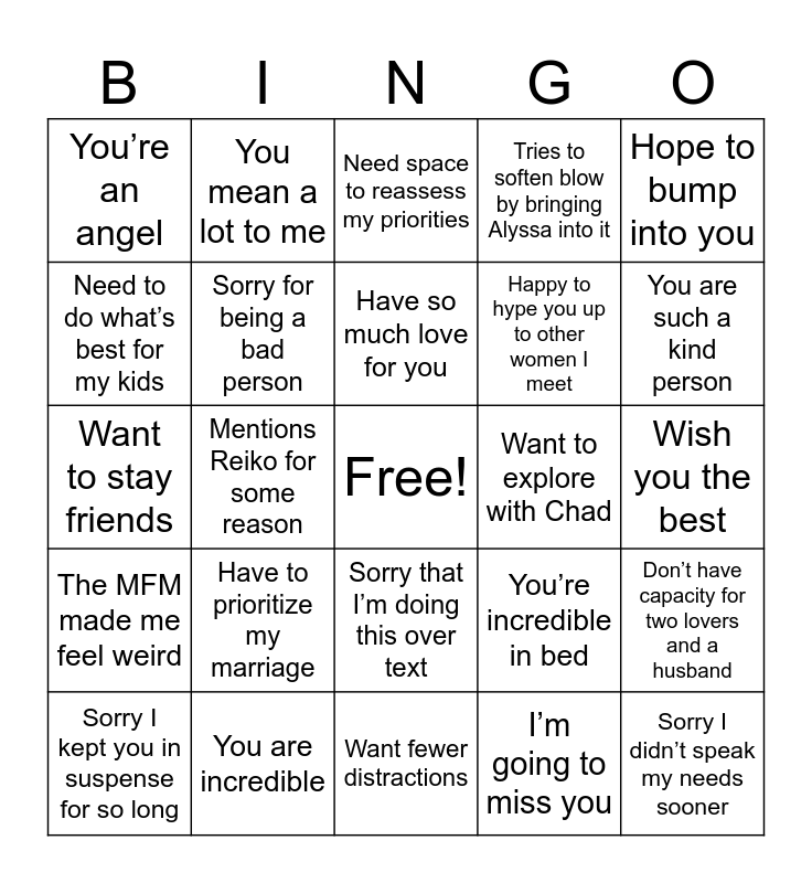 This bingo card has a free space and 24 words: Have to prioritize my marriage, You are incredible, Have so much love for you, Sorry I kept you in suspense for so long, Hope to bump into you, You’re an angel, Need to do what’s best for my kids, You mean a lot to me, Want to explore with Chad, Sorry that I’m doing this over text, Happy to hype you up to other women I meet, Want to stay friends, You’re incredible in bed, Don’t have capacity for two lovers and a husband, Sorry for being a bad person, I’m going to miss you, Wish you the best, Need space to reassess my priorities, You are such a kind person, Mentions Reiko for some reason, Sorry I didn’t speak my needs sooner, The MFM made me feel weird, Tries to soften blow by bringing Alyssa into it and Want fewer distractions.