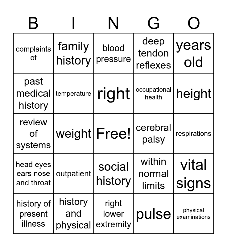 This bingo card has a free space and 24 words: outpatient, history and physical, right, history of present illness, years old, complaints of, past medical history, family history, cerebral palsy, social history, occupational health, review of systems, within normal limits, vital signs, temperature, pulse, respirations, blood pressure, height, weight, physical examinations, head eyes ears nose and throat, deep tendon reflexes and right lower extremity.
