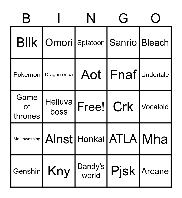 This bingo card has a free space and 24 words: Alnst, Kny, Aot, Genshin, Bleach, Bllk, Pokemon, Omori, Crk, Honkai, Fnaf, Game of thrones, ATLA, Mha, Draganronpa, Pjsk, Vocaloid, Splatoon, Undertale, Helluva boss, Arcane, Mouthwashing, Sanrio and Dandy's world.