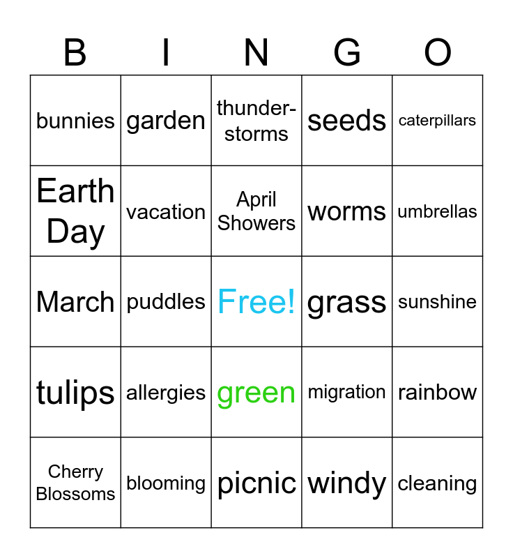 This bingo card has a free space and 24 words: allergies, blooming, April Showers, Cherry Blossoms, caterpillars, bunnies, Earth Day, garden, grass, green, worms, March, migration, rainbow, vacation, windy, sunshine, thunder-storms, umbrellas, puddles, cleaning, tulips, seeds and picnic.
