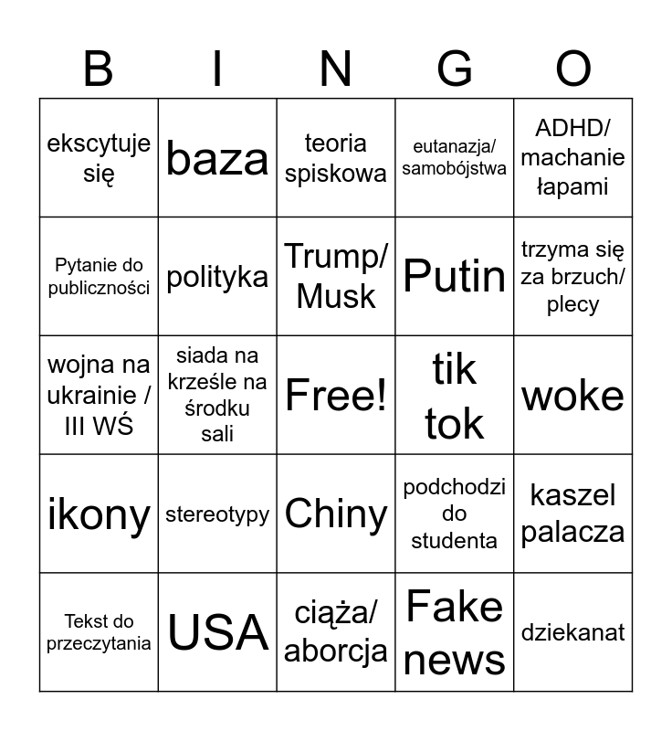 This bingo card has a free space and 24 words: stereotypy, USA, Trump/ Musk, Tekst do przeczytania, ADHD/ machanie łapami, ekscytuje się, Pytanie do publiczności, baza, tik tok, Chiny, Putin, wojna na ukrainie / III WŚ, podchodzi do studenta, kaszel palacza, polityka, Fake news, woke, teoria spiskowa, trzyma się za brzuch/ plecy, siada na krześle na środku sali, dziekanat, ikony, eutanazja/ samobójstwa and ciąża/ aborcja.