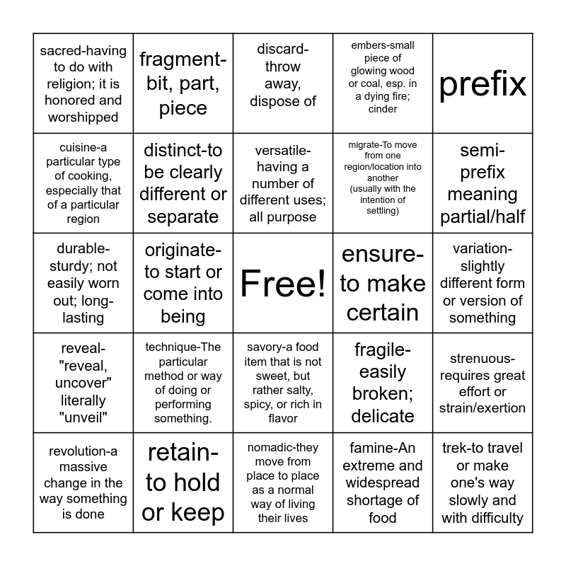 This bingo card has a free space and 28 words: strenuous-requires great effort or strain/exertion, insulate-to cover, line, or surround with a material that reduces or stops the movement of heat, electricity, or sound, migrate-To move from one region/location into another (usually with the intention of settling), famine-An extreme and widespread shortage of food, cuisine-a particular type of cooking, especially that of a particular region, discard-throw away, dispose of, fragment-bit, part, piece, reveal-"reveal, uncover" literally "unveil", ensure-to make certain, revolution-a massive change in the way something is done, durable-sturdy; not easily worn out; long-lasting, embers-small piece of glowing wood or coal, esp. in a dying fire; cinder, retain-to hold or keep, nomadic-they move from place to place as a normal way of living their lives, semi-prefix meaning partial/half, migrate-To move from one region into another., technique-The particular method or way of doing or performing something., distinct-to be clearly different or separate, versatile-having a number of different uses; all purpose, savory-a food item that is not sweet, but rather salty, spicy, or rich in flavor, sacred-having to do with religion; it is honored and worshipped, cuisine-a particular type of cooking, especially the type of cooking done in a particular place in the world, trek-to travel or make one's way slowly and with difficulty, originate-to start or come into being, variation-slightly different form or version of something, fragile-easily broken; delicate, prefix and suffix.
