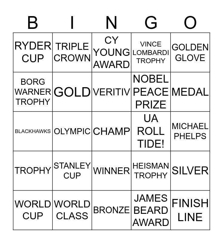 This bingo card has 25 words: STANLEY CUP, BRONZE, VERITIV, WORLD CUP, GOLDEN GLOVE, RYDER CUP, BORG WARNER TROPHY, TRIPLE CROWN, UA ROLL TIDE!, WINNER, NOBEL PEACE PRIZE, BLACKHAWKS, HEISMAN TROPHY, SILVER, GOLD, FINISH LINE, MICHAEL PHELPS, CY YOUNG AWARD, MEDAL, OLYMPIC, CHAMP, WORLD CLASS, TROPHY, VINCE LOMBARDI TROPHY and JAMES BEARD AWARD.