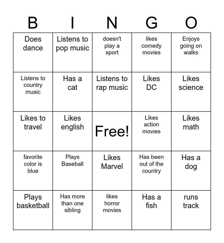 This bingo card has a free space and 24 words: Plays Baseball, Has more than one sibling, Listens to rap music, Plays basketball, Enjoys going on walks, Does dance, Listens to country music, Listens to pop music, Likes action movies, Likes Marvel, Likes DC, Likes to travel, Has been out of the country, Has a dog, Has a cat, Has a fish, Likes math, doesn't play a sport, Likes science, Likes english, runs track, favorite color is blue, likes comedy movies and likes horror movies.