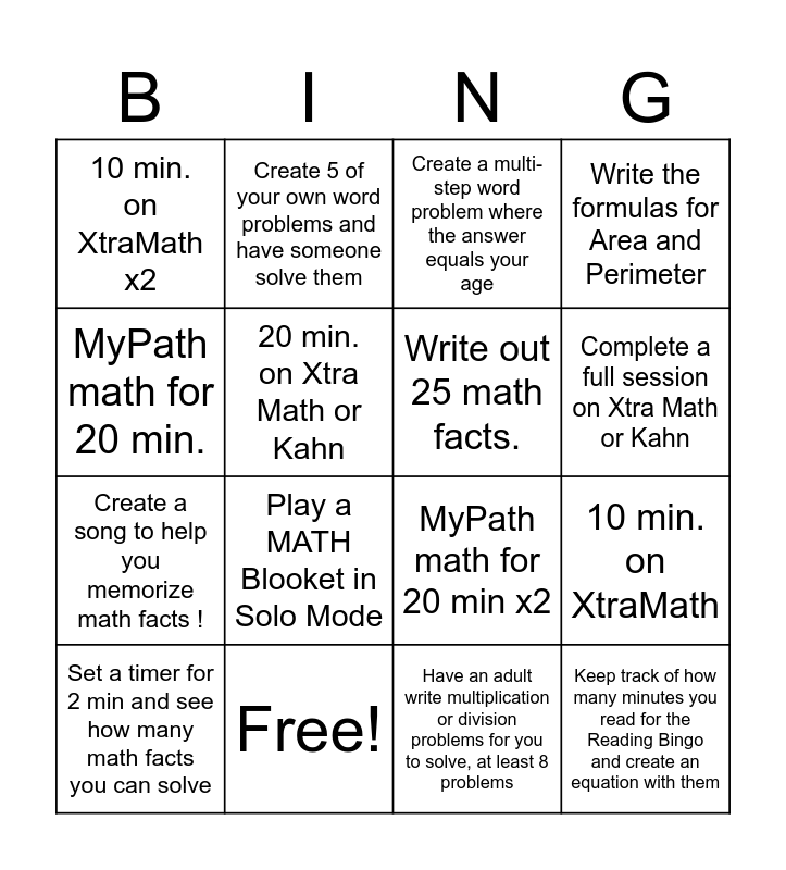 This bingo card has 20 words: 10 min. on XtraMath, Identify 10 sets of parallel and intersecting lines around your home, Create a multi-step word problem where the answer equals your age, Write down 5 places you see right angles in your home, Set a timer for 2 min and see how many math facts you can solve, MyPath math for 20 min., Free!, 10 min. on XtraMath x2, Create a song to help you memorize math facts !, Create 5 of your own word problems and have someone solve them, Play a MATH Blooket in Solo Mode, MyPath math for 20 min x2, 20 min. on Xtra Math or Kahn, Keep track of how many minutes you read for the Reading Bingo and create an equation with them, Write out 25 math facts., Practice math facts with an adult, Complete a full session on Xtra Math or Kahn, Write the formulas for Area and Perimeter, Have an adult write multiplication or division problems for you to solve, at least 8 problems and Practice math facts for 15 min..
