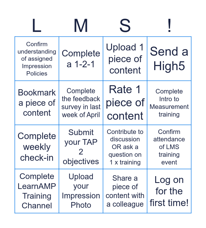 This bingo card has 16 words: Upload your Impression Photo, Confirm attendance of LMS training event, Upload 1 piece of content, Confirm understanding of assigned Impression Policies, Complete weekly check-in, Complete a 1-2-1, Contribute to discussion OR ask a question on 1 x training, Share a piece of content with a colleague, Bookmark a piece of content, Complete the feedback survey in last week of April, Complete LearnAMP Training Channel, Send a High5, Submit your TAP 2 objectives, Complete Intro to Measurement training, Rate 1 piece of content and Log on for the first time!.