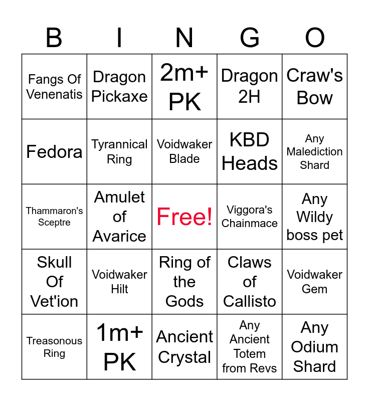 This bingo card has a free space and 24 words: Voidwaker Hilt, 1m+ PK, Voidwaker Blade, Treasonous Ring, Craw's Bow, Fangs Of Venenatis, Fedora, Dragon Pickaxe, Viggora's Chainmace, Ring of the Gods, KBD Heads, Thammaron's Sceptre, Claws of Callisto, Voidwaker Gem, Tyrannical Ring, Any Ancient Totem from Revs, Any Wildy boss pet, 2m+ PK, Any Malediction Shard, Amulet of Avarice, Any Odium Shard, Skull Of Vet'ion, Dragon 2H and Ancient Crystal.