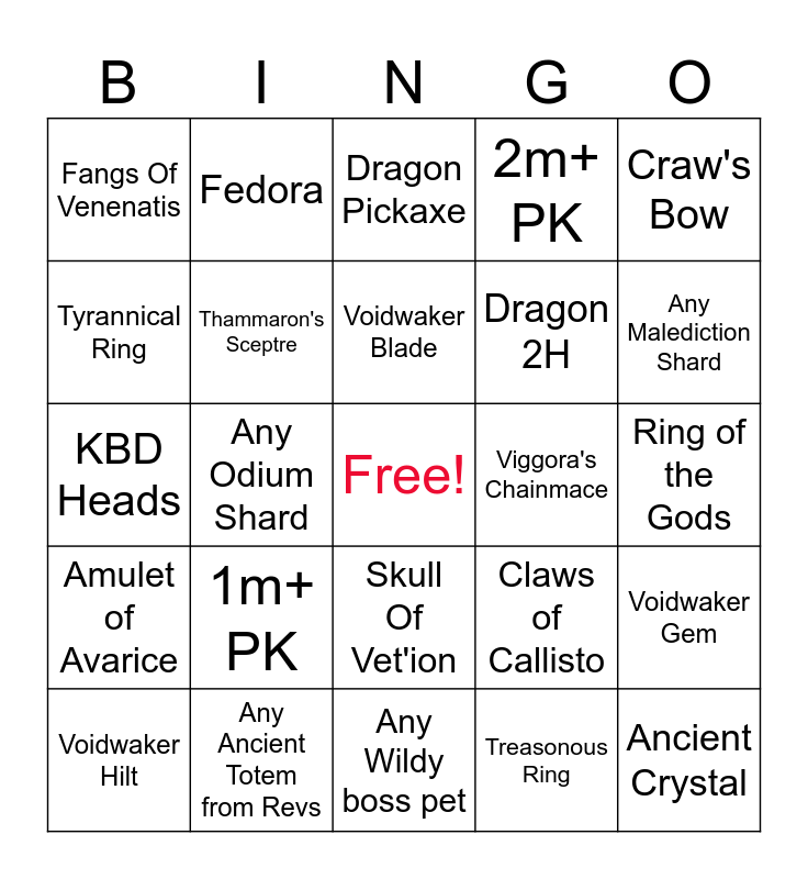 This bingo card has a free space and 24 words: Voidwaker Hilt, 1m+ PK, Voidwaker Blade, Treasonous Ring, Craw's Bow, Fangs Of Venenatis, Fedora, Dragon Pickaxe, Viggora's Chainmace, Ring of the Gods, KBD Heads, Thammaron's Sceptre, Claws of Callisto, Voidwaker Gem, Tyrannical Ring, Any Ancient Totem from Revs, Any Wildy boss pet, 2m+ PK, Any Malediction Shard, Amulet of Avarice, Any Odium Shard, Skull Of Vet'ion, Dragon 2H and Ancient Crystal.