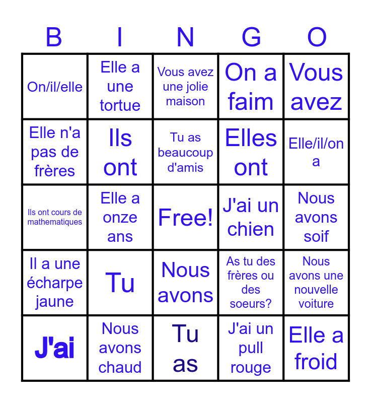 This bingo card has a free space and 29 words: J'ai, Vous, Elle a onze ans, Nous, On/il/elle, Vous avez une jolie maison, Ils ont, Tu, J'ai un chien, Nous avons chaud, Nous avons soif, Elle a froid, Tu as, J'ai un pull rouge, Elle/il/on a, Je, Nous avons, Il a une écharpe jaune, Vous avez, Ils ont cours de mathematiques, As tu des frères ou des soeurs?, Vous avez besoin d'un pantalon, Elles ont, Elle n'a pas de frères, On a faim, Elle a une tortue, Nous avons une nouvelle voiture, Tu as beaucoup d'amis and Vous avez Rendez-vous a 16 heures.