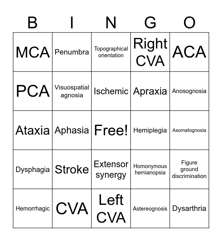This bingo card has a free space and 24 words: Stroke, CVA, Ischemic, Hemorrhagic, ACA, MCA, PCA, Penumbra, Hemiplegia, Extensor synergy, Apraxia, Ataxia, Homonymous hemianopsia, Figure ground discrimination, Visuospatial agnosia, Astereognosis, Asomatognosia, Topographical orientation, Anosognosia, Aphasia, Dysarthria, Dysphagia, Right CVA and Left CVA.
