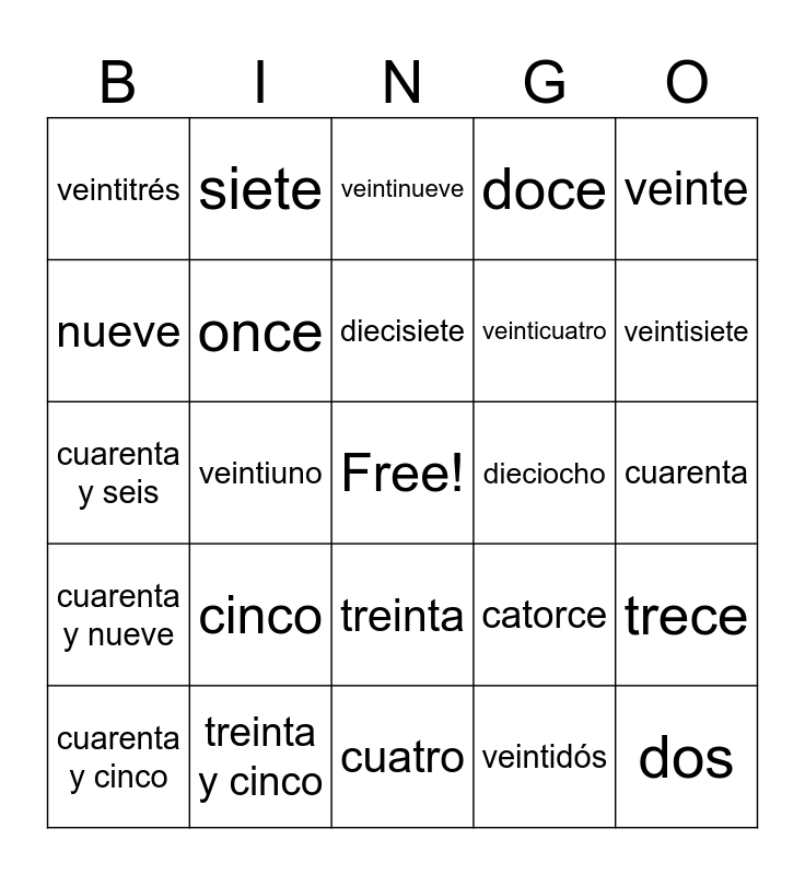 This bingo card has a free space and 50 words: uno, dos, tres, cuatro, cinco, seis, siete, ocho, nueve, diez, once, doce, trece, catorce, quince, dieciséis, diecisiete, dieciocho, diecinueve, veinte, veintiuno, veintidós, veintitrés, veinticuatro, veinticinco, veintiséis, veintisiete, veintiocho, veintinueve, treinta, treinta y uno, treinta y dos, treinta y tres, treinta y cuatro, treinta y cinco, treinta y seis, treinta y siete, treinta y ocho, treinta y nueve, cuarenta, cuarenta y uno, cuarenta y dos, cuarenta y tres, cuarenta y cuatro, cuarenta y cinco, cuarenta y seis, cuarenta y siete, cuarenta y ocho, cuarenta y nueve and cincuenta.