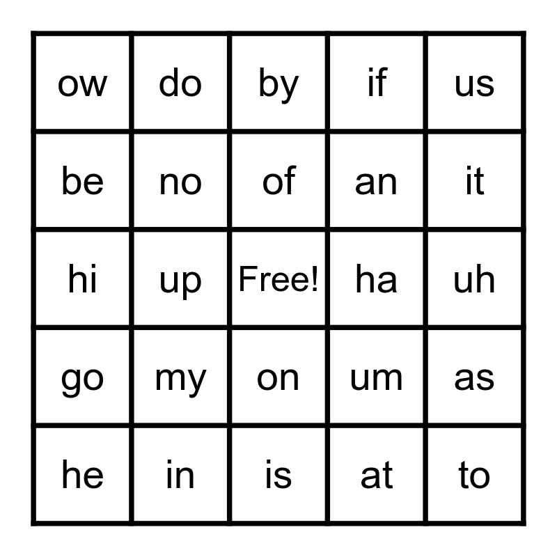This bingo card has a free space and 28 words: as, am, an, at, be, by, do, go, ha, he, hi, if, in, is, it, me, my, no, of, on, ow, ox, to, up, uh, um, us and we.