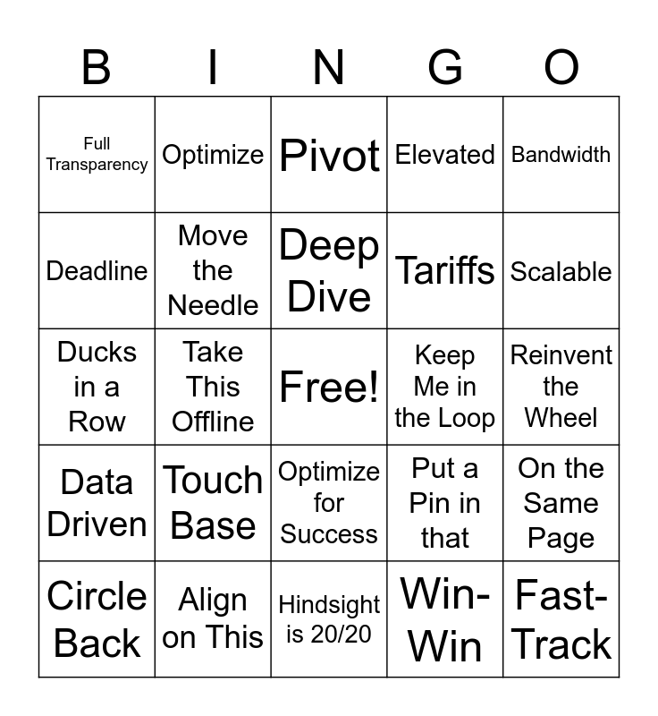 This bingo card has a free space and 29 words: Circle Back, EOD, Take This Offline, Streamline, Full Transparency, Pivot, Move the Needle, Touch Base, Keep Me in the Loop, Align on This, Reinvent the Wheel, Fast-Track, Hindsight is 20/20, Win-Win, Scalable, To recap, Optimize for Success, Data Driven, Bandwidth, Ducks in a Row, Put a Pin in that, Ping Me, Tariffs, Deadline, Elevated, Optimize, On the Same Page, Deep Dive and Trajectory.