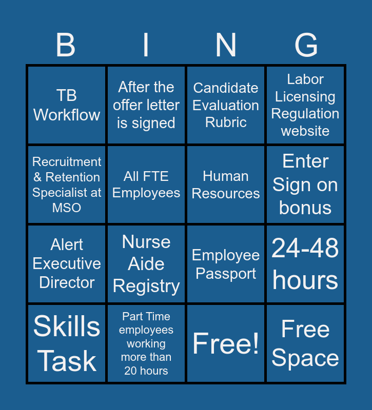 This bingo card has 17 words: Free!, Skills Task, Candidate Evaluation Rubric, TB Workflow, Nurse Aide Registry, Labor Licensing Regulation website, 24-48 hours, Human Resources, Enter Sign on bonus, All FTE Employees, Part Time employees working more than 20 hours, Employee Passport, Recruitment & Retention Specialist at MSO, After the offer letter is signed, Alert Executive Director, Repost the job every month and refresh every week and Free Space.
