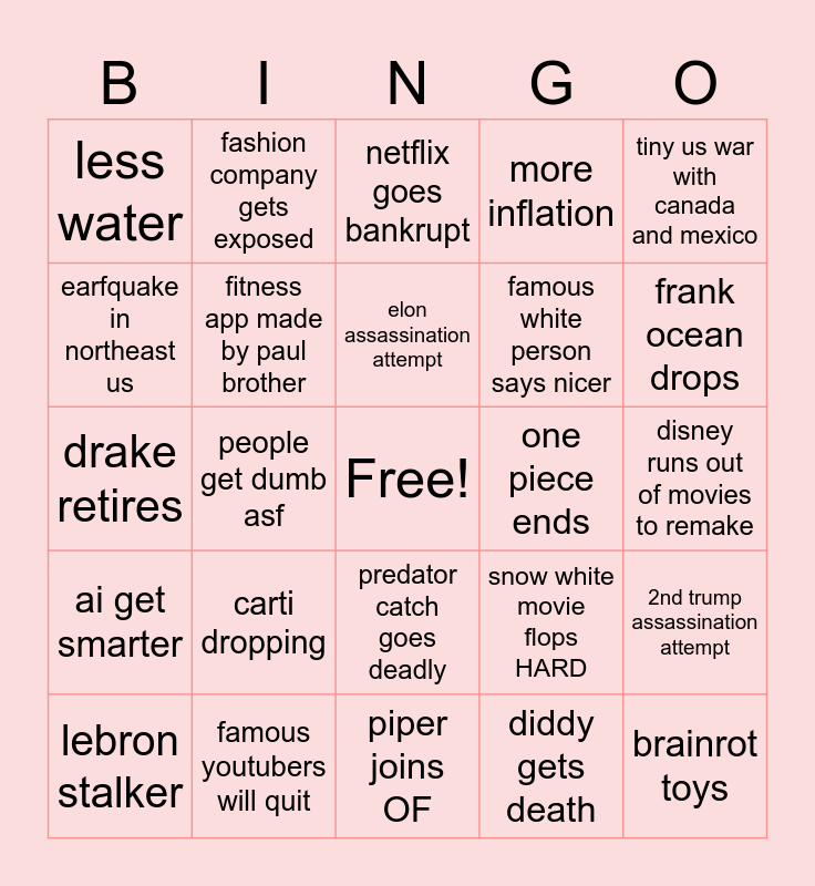 This bingo card has a free space and 24 words: carti dropping, famous youtubers will quit, elon assassination attempt, lebron stalker, tiny us war with canada and mexico, less water, earfquake in northeast us, fashion company gets exposed, one piece ends, predator catch goes deadly, famous white person says nicer, drake retires, snow white movie flops HARD, 2nd trump assassination attempt, fitness app made by paul brother, diddy gets death, disney runs out of movies to remake, netflix goes bankrupt, frank ocean drops, people get dumb asf, brainrot toys, ai get smarter, more inflation and piper joins OF.