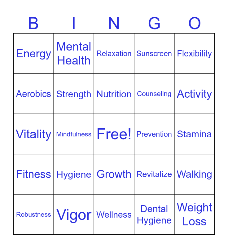 This bingo card has a free space and 33 words: Sleep, Hydrate, Mindfulness, Wellbeing, Fitness, Strength, Flexibility, Robustness, Mental Health, Exercise, Nutrition, Relaxation, Massage, Self-care, Prevention, Activity, Vigor, Vitality, Hygiene, Revitalize, Growth, Transformation, Energy, Stamina, Wellness, Weight Loss, Sunscreen, Counseling, Aerobics, Walking, Immunizations, Dental Hygiene and Cardio.