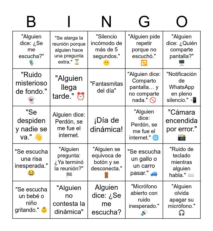This bingo card has a free space and 31 words: Alguien dice: ¿Se me escucha?, Alguien llega tarde, Alguien dice: Perdón, se me fue el internet., "Se escucha un perro de fondo." 🐶, "Alguien dice: ¿Se me escucha?" 🎙️, "Silencio incómodo de más de 5 segundos." 😶, "Alguien llega tarde." ⏰, "Se escucha un gallo o un carro pasar." 🚙, "Alguien dice: Perdón, se me fue el internet." 🌐, "Micrófono abierto con ruido inesperado." 🔊, "Cámara encendida por error." 📸, "Alguien olvida apagar su micrófono." 🎧, "Se queda congelada la pantalla." 🧊, "El jefe dice: Hagámoslo rápido." ⚡, "Notificación de WhatsApp en pleno silencio." 📲, "Alguien dice: Pasemos a la siguiente diapositiva." 📊, "Ruido de teclado mientras alguien habla." ⌨️, "Alguien pregunta: ¿Ya terminó la reunión?" 🏁, "Se escucha una risa inesperada." 😂, "Alguien se equivoca de botón y se desconecta." 🚪, "Alguien dice: ¿Quién comparte pantalla?" 🖥️, "Gente hablando al mismo tiempo." 🔀, "Se escucha un bebé o niño gritando." 👶, "Se alarga la reunión porque alguien hace una pregunta extra." ⏳, "Alguien dice: Comparto pantalla… y no comparte nada." 🚫, "Ruido misterioso de fondo." 👻, "Alguien pide repetir porque no escuchó." 🔁, "Se despiden y nadie se va." 👋, "Alguien no contesta la dinámica", "Fantasmitas del día" and "Alguien pregunta: ¿Qué dijeron? Me perdí un ratito." 🌀.