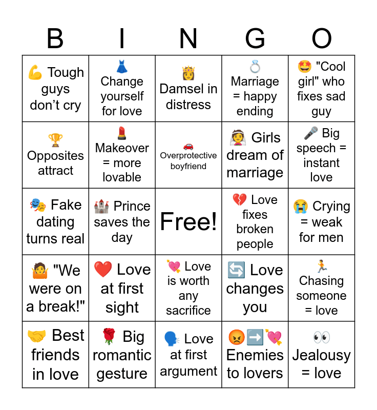 This bingo card has a free space and 24 words: β€οΈ Love at first sight, πΉ Big romantic gesture, π Overprotective boyfriend, π€ Best friends in love, π€© "Cool girl" who fixes sad guy, πͺ Tough guys donβt cry, π Opposites attract, π Change yourself for love, π Love fixes broken people, π Love is worth any sacrifice, π° Girls dream of marriage, π Fake dating turns real, π Love changes you, π Chasing someone = love, π Makeover = more lovable, π‘β‘οΈπ Enemies to lovers, π Crying = weak for men, πΈ Damsel in distress, π€ Big speech = instant love, π° Prince saves the day, π Jealousy = love, π€· "We were on a break!", π Marriage = happy ending and π£ Love at first argument.