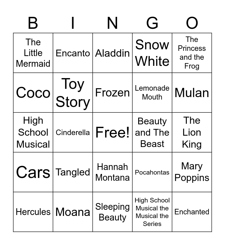 This bingo card has a free space and 24 words: Tangled, Moana, Frozen, Hercules, The Princess and the Frog, The Little Mermaid, Coco, Encanto, Beauty and The Beast, Hannah Montana, Lemonade Mouth, High School Musical, Pocahontas, Mary Poppins, Toy Story, High School Musical the Musical the Series, The Lion King, Aladdin, Mulan, Cinderella, Enchanted, Cars, Snow White and Sleeping Beauty.