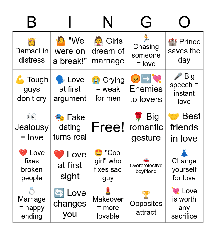 This bingo card has a free space and 24 words: β€οΈ Love at first sight, π Love changes you, π Crying = weak for men, π Marriage = happy ending, π° Prince saves the day, πΈ Damsel in distress, πͺ Tough guys donβt cry, π€· "We were on a break!", πΉ Big romantic gesture, π€© "Cool girl" who fixes sad guy, π‘β‘οΈπ Enemies to lovers, π Jealousy = love, π Overprotective boyfriend, π Change yourself for love, π£ Love at first argument, π Opposites attract, π€ Best friends in love, π° Girls dream of marriage, π€ Big speech = instant love, π Fake dating turns real, π Love is worth any sacrifice, π Love fixes broken people, π Chasing someone = love and π Makeover = more lovable.