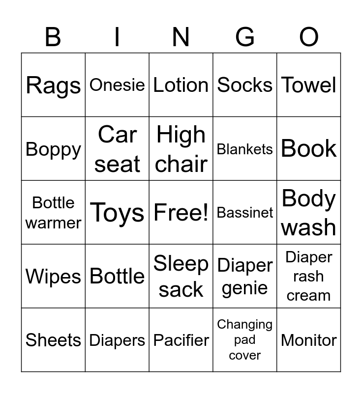 This bingo card has a free space and 25 words: Bottle, Pacifier, High chair, Sheets, Towel, Rags, Boppy, Onesie, Bassinet, Sleep sack, Blankets, Bottle warmer, Diaper genie, Diaper rash cream, Car seat, Stroller, Body wash, Lotion, Book, Toys, Monitor, Diapers, Wipes, Socks and Changing pad cover.