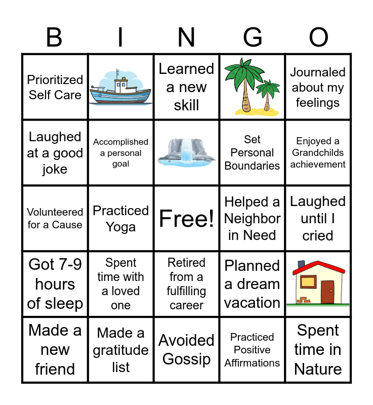 This bingo card has 5 images, a free space and 24 words: Made a new friend, Read a Great Book, Practiced Yoga, Completed a Puzzle, Prioritized Self Care, Learned a new skill, Accomplished a personal goal, Spent time with a loved one, Helped a Neighbor in Need, Made a gratitude list, Laughed until I cried, Spent time in Nature, Avoided Gossip, Practiced Positive Affirmations, Enjoyed a Grandchilds achievement, Expressed myself Artistically, Retired from a fulfilling career, Got 7-9 hours of sleep, Journaled about my feelings, Volunteered for a Cause, Planned a dream vacation, Received an Award, Set Personal Boundaries and Laughed at a good joke.