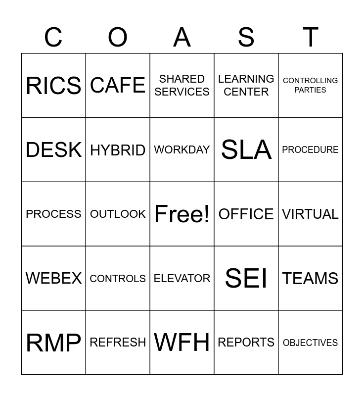 This bingo card has a free space and 39 words: CAOS, KYC, DMP, SEI, TEAMS, WEBEX, OUTLOOK, CONFLICT CHECK, OFFICE, VIRTUAL, DESK, CAFE, MAINTENANCE, PROCEDURE, PROCESS, CONTROLS, ELEVATOR, LEARNING CENTER, BPM, RMP, HYBRID, WORKDAY, REPORTS, CONTROLLING PARTIES, UBO, REFRESH, WFH, ONBOARDING, RFI, RICS, TRUSTEE, FINAL, SLA, OBJECTIVES, ACCOUNT OPENING, TOWNHALL, SHARED SERVICES, AGENT and ESCROW.