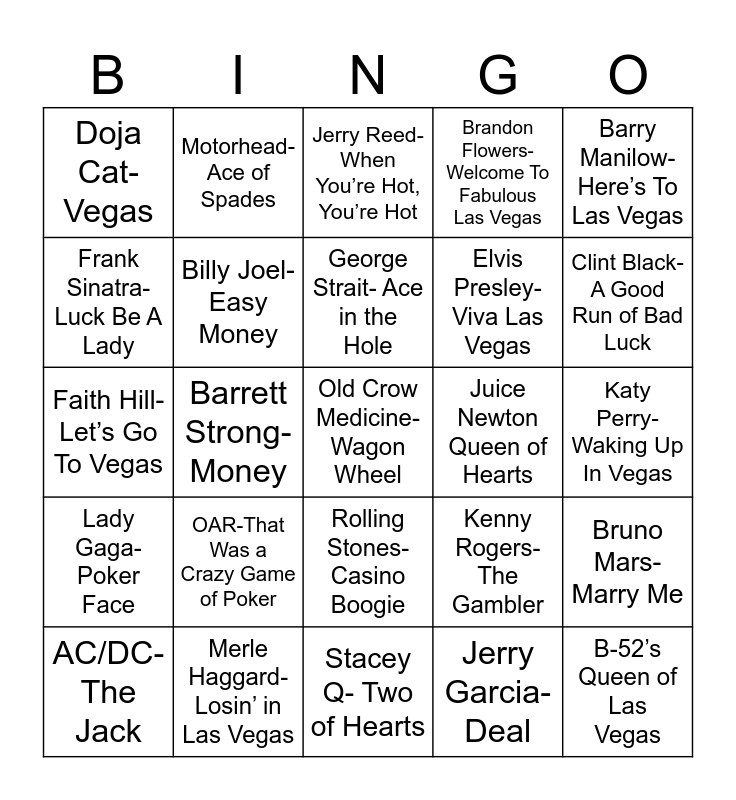 This bingo card has 26 words: Rolling Stones- Casino Boogie, Jerry Garcia- Deal, George Strait- Ace in the Hole, Merle Haggard- Losin’ in Las Vegas, Barry Manilow- Here’s To Las Vegas, Doja Cat- Vegas, Frank Sinatra- Luck Be A Lady, Motorhead- Ace of Spades, Katy Perry- Waking Up In Vegas, Kenny Rogers- The Gambler, Elvis Presley- Viva Las Vegas, Faith Hill- Let’s Go To Vegas, Bruno Mars- Marry Me, AC/DC- The Jack, Barrett Strong- Money, Sheryl Crow- Leaving Las Vegas, Brandon Flowers- Welcome To Fabulous Las Vegas, Lady Gaga- Poker Face, Jerry Reed- When You’re Hot, You’re Hot, Old Crow Medicine- Wagon Wheel, Clint Black- A Good Run of Bad Luck, Stacey Q- Two of Hearts, Juice Newton Queen of Hearts, OAR-That Was a Crazy Game of Poker, Billy Joel- Easy Money and B-52’s Queen of Las Vegas.