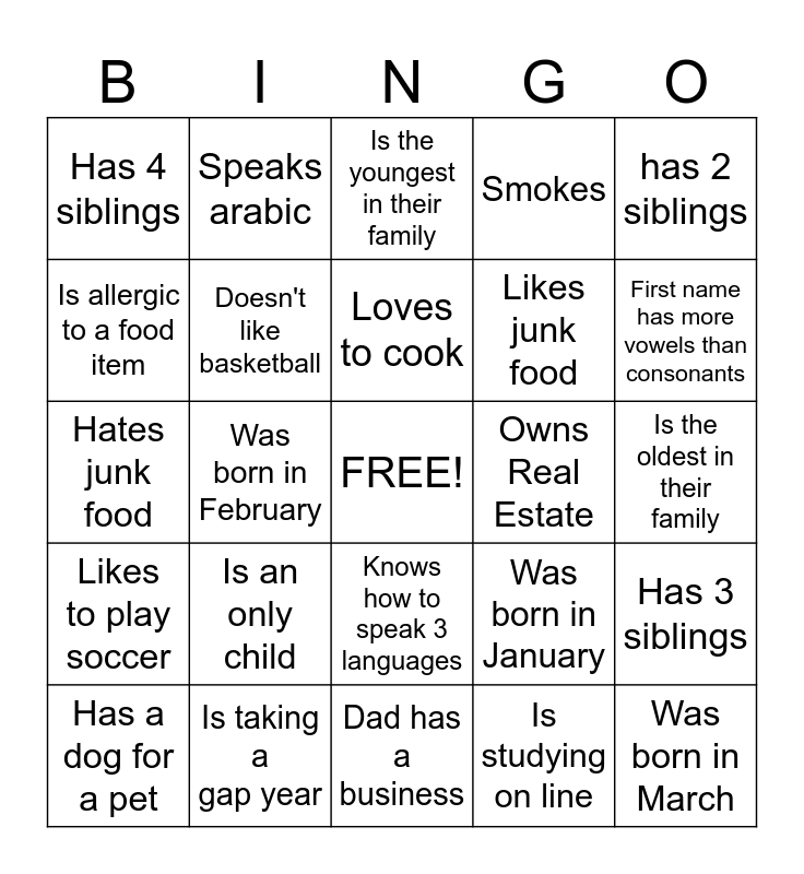 This bingo card has a free space and 24 words: Is an only child, Is taking a gap year, Loves to cook, Has a dog for a pet, has 2 siblings, Has 4 siblings, Is allergic to a food item, Speaks arabic, Owns Real Estate, Knows how to speak 3 languages, Likes junk food, Hates junk food, Was born in January, Has 3 siblings, Doesn't like basketball, Is studying on line, Is the oldest in their family, Is the youngest in their family, First name has more vowels than consonants, Was born in February, Was born in March, Likes to play soccer, Smokes and Dad has a business.
