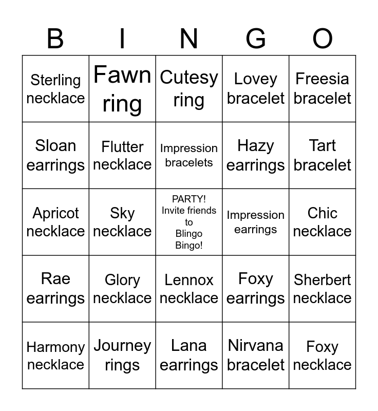 This bingo card has a free space and 24 words: Glory necklace, Journey rings, Impression bracelets, Harmony necklace, Freesia bracelet, Sterling necklace, Sloan earrings, Fawn ring, Impression earrings, Lennox necklace, Hazy earrings, Apricot necklace, Foxy earrings, Sherbert necklace, Flutter necklace, Nirvana bracelet, Chic necklace, Cutesy ring, Tart bracelet, Sky necklace, Foxy necklace, Rae earrings, Lovey bracelet and Lana earrings.