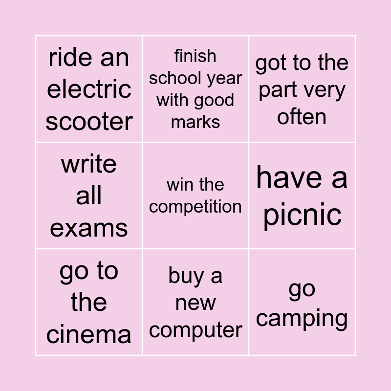 This bingo card has a free space and 8 words: write all exams, finish school year with good marks, have a picnic, go to the cinema, got to the part very often, ride an electric scooter, buy a new computer and go camping.