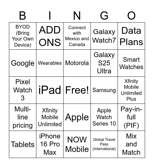 This bingo card has a free space and 24 words: Xfinity Mobile Unlimited, iPhone 16 Pro Max, Motorola, Tablets, Data Plans, BYOD (Bring Your Own Device), Google, ADD ONS, Samsung, Apple, Galaxy S25 Ultra, Pixel Watch 3, Apple Watch Series 10, Pay-in-full (PIF), Wearables, Global Travel Pass (International), Xfinity Mobile Unlimited Plus, Connect with Mexico and Canada, Smart Watches, iPad, Mix and Match, Multi-line pricing, Galaxy Watch7 and NOW Mobile.