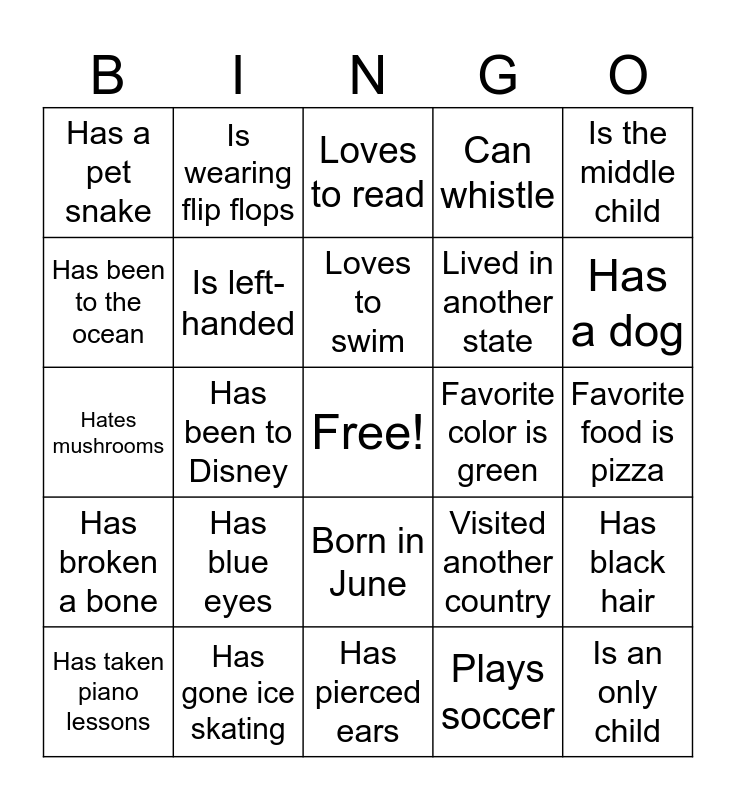 This bingo card has a free space and 24 words: Has blue eyes, Has gone ice skating, Loves to swim, Has taken piano lessons, Is the middle child, Has a pet snake, Has been to the ocean, Is wearing flip flops, Favorite color is green, Born in June, Lived in another state, Hates mushrooms, Visited another country, Has black hair, Is left-handed, Plays soccer, Favorite food is pizza, Loves to read, Has a dog, Has been to Disney, Is an only child, Has broken a bone, Can whistle and Has pierced ears.