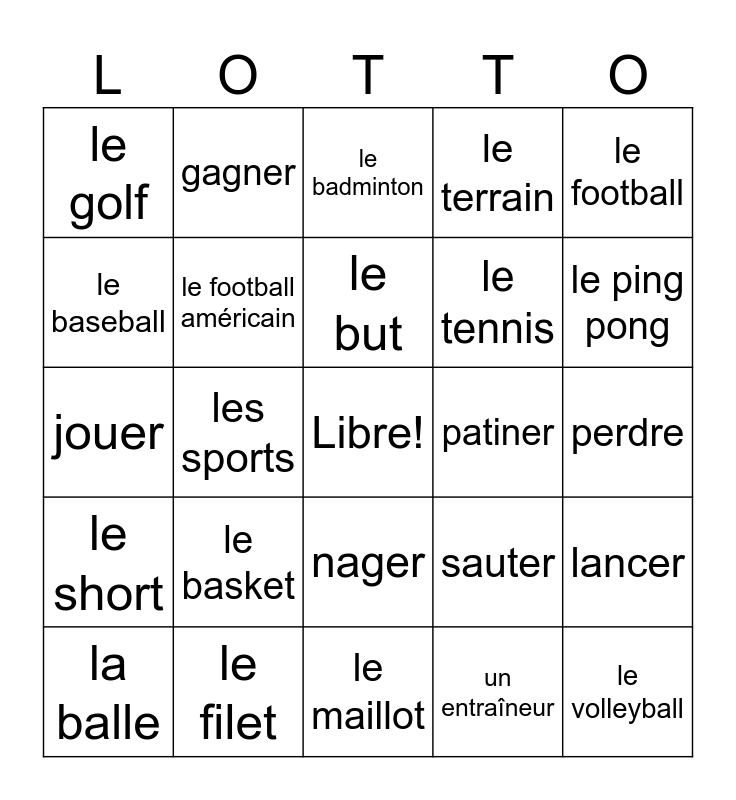This bingo card has a free space and 24 words: le basket, le filet, le but, la balle, le football, le golf, le baseball, gagner, patiner, nager, le tennis, jouer, sauter, lancer, le football américain, un entraîneur, perdre, le badminton, le ping pong, les sports, le volleyball, le short, le terrain and le maillot.