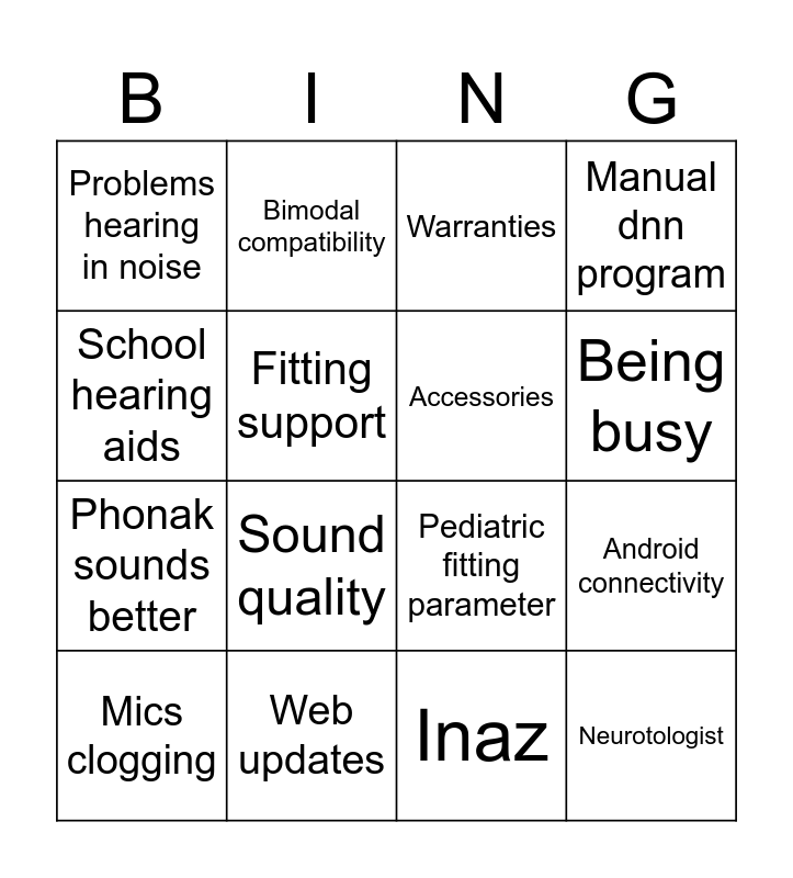 This bingo card has 16 words: Web updates, Android connectivity, Warranties, Problems hearing in noise, Phonak sounds better, Bimodal compatibility, Pediatric fitting parameter, Inaz, School hearing aids, Fitting support, Mics clogging, Manual dnn program, Sound quality, Being busy, Accessories and Neurotologist.