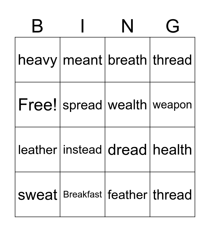 This bingo card has 16 words: Breakfast, health, breath, heavy, leather, meant, dread, feather, Free!, spread, sweat, thread, instead, weapon, wealth and thread.