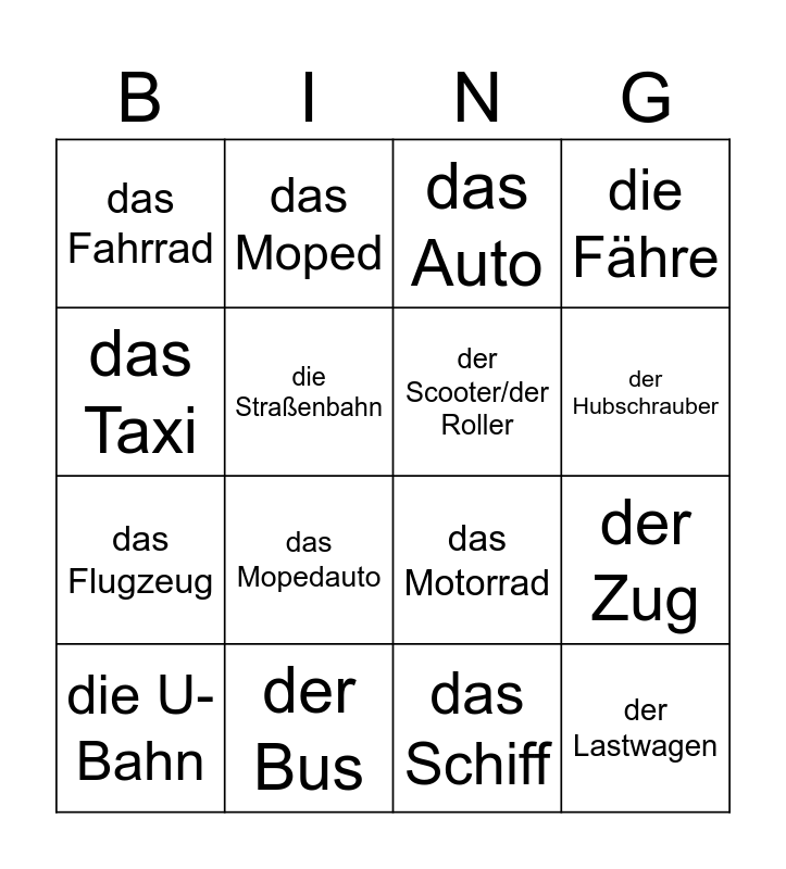 This bingo card has 16 words: der Bus, der Zug, das Auto, das Fahrrad, das Flugzeug, das Moped, das Motorrad, das Schiff, das Taxi, die Straßenbahn, die U-Bahn, die Fähre, das Mopedauto, der Hubschrauber, der Scooter/der Roller and der Lastwagen.