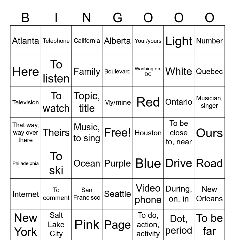This bingo card has a free space and 104 words: A lot of, To be beautiful, pretty, Family, Fun, You and me, Vacation, To be born in, To live in, Beach, Ocean, To rollerblade, To visit, America, United States (US), Alaska, Hawaii, California, Arizona, Colorado, Montana, Texas, New York, West Virginia, Canada, Manitoba, Ontario, Quebec, Atlanta, Boston, Chicago City, Alberta, Houston, Los Angeles, New Orleans, Philadelphia, Salt Lake City, San Francisco, City/town, Washington, DC, To be close to, near, To be far, That way, way over there, To comment, Topic, title, Seattle, Your/yours, His, hers, its, Ours, Yours (plural), Theirs, Color, My/mine, Blue, Brown, Gray, Green, Orange, Pink, Black, Red, White, Yellow, To act, show, Actor, Car,, Purple, Dark, Light, Musician, singer, Television, To watch, Love-it (kiss fist), to drive, At (@), Dot, period, Email, email address, Internet, To listen, Music, to sing, Bright - bright blue, Web page, Address, Number, Street, Telephone, Avenue, Page, Court, Drive, Road, Pager, New, Old, Boulevard, Video phone, To be from, To grow up, Here, To ski, Washington, Oregon, To do, action, activity, During, on, in and Mexico.