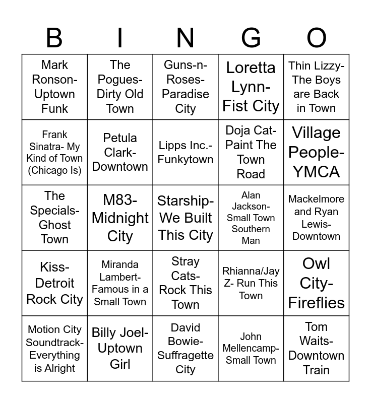 This bingo card has 26 words: Stray Cats- Rock This Town, John Mellencamp- Small Town, Lipps Inc.- Funkytown, Billy Joel- Uptown Girl, Thin Lizzy- The Boys are Back in Town, Mark Ronson- Uptown Funk, Frank Sinatra- My Kind of Town (Chicago Is), The Pogues- Dirty Old Town, Mackelmore and Ryan Lewis- Downtown, Rhianna/Jay Z- Run This Town, Doja Cat- Paint The Town Road, The Specials- Ghost Town, Owl City- Fireflies, Motion City Soundtrack- Everything is Alright, M83- Midnight City, The Lovin’ Spoonful- Summer in the City, Loretta Lynn- Fist City, Kiss- Detroit Rock City, Guns-n-Roses- Paradise City, Starship- We Built This City, Village People- YMCA, David Bowie- Suffragette City, Alan Jackson- Small Town Southern Man, Miranda Lambert- Famous in a Small Town, Petula Clark- Downtown and Tom Waits- Downtown Train.