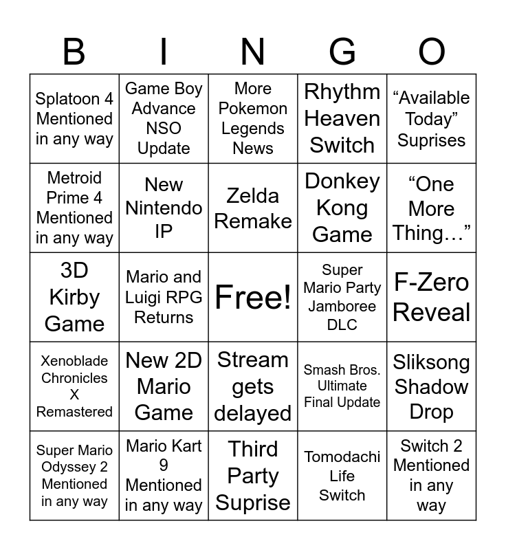 This bingo card has a free space and 24 words: New 2D Mario Game, Mario Kart 9 Mentioned in any way, Zelda Remake, Super Mario Odyssey 2 Mentioned in any way, “Available Today” Suprises, Splatoon 4 Mentioned in any way, Metroid Prime 4 Mentioned in any way, Game Boy Advance NSO Update, Super Mario Party Jamboree DLC, Stream gets delayed, Donkey Kong Game, 3D Kirby Game, Smash Bros. Ultimate Final Update, Sliksong Shadow Drop, New Nintendo IP, Tomodachi Life Switch, F-Zero Reveal, More Pokemon Legends News, “One More Thing…”, Mario and Luigi RPG Returns, Switch 2 Mentioned in any way, Xenoblade Chronicles X Remastered, Rhythm Heaven Switch and Third Party Suprise.