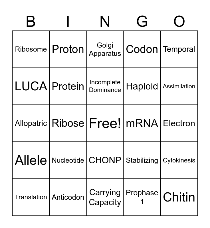 This bingo card has a free space and 29 words: Translation, Transcription, Ribose, Nucleus, Ribosome, Golgi Apparatus, Protein, Nucleotide, mRNA, Anticodon, Electron, Chitin, Carrying Capacity, Prophase 1, Assimilation, Carbon Fixation, CHONP, Allele, Temporal, Allopatric, Stabilizing, Osmosis, Haploid, LUCA, Codon, Proton, Cytokinesis, Incomplete Dominance and Diffusion.