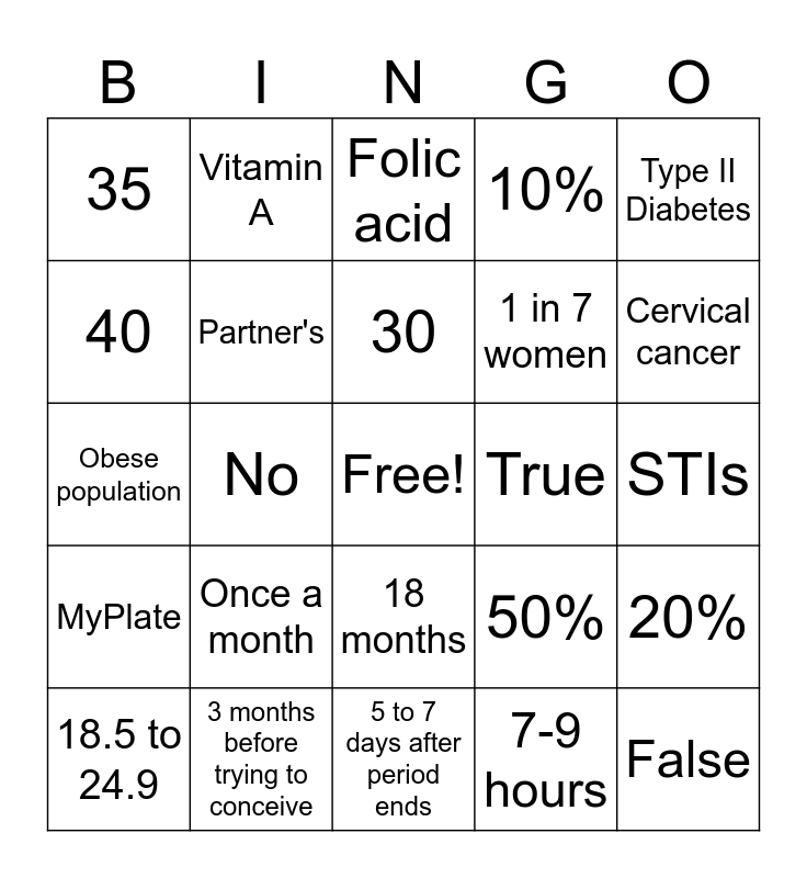 This bingo card has a free space and 29 words: 18.5 to 24.9, Complications, No, Yes, 35, Folic acid, Partner's, Once a month, True, 3 months before trying to conceive, STIs, False, 5 to 7 days after period ends, 7-9 hours, Cervical cancer, 40%, 18 months, MyPlate, Type II Diabetes, Obese population, 50%, Condoms and abstinence, 1 in 7 women, 40, 10%, Vitamin A, 20%, 30 and 1 year.
