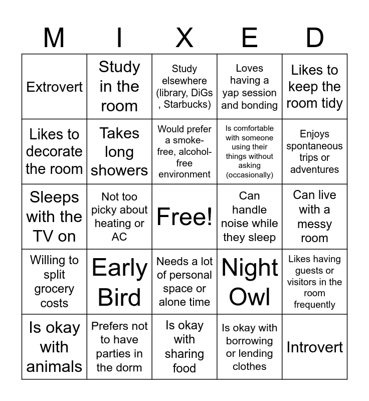 This bingo card has a free space and 24 words: Early Bird, Prefers not to have parties in the dorm, Would prefer a smoke-free, alcohol-free environment, Is okay with animals, Likes to keep the room tidy, Extrovert, Likes to decorate the room, Study in the room, Can handle noise while they sleep, Needs a lot of personal space or alone time, Is comfortable with someone using their things without asking (occasionally), Sleeps with the TV on, Night Owl, Likes having guests or visitors in the room frequently, Takes long showers, Is okay with borrowing or lending clothes, Can live with a messy room, Study elsewhere (library, DiGs , Starbucks), Enjoys spontaneous trips or adventures, Not too picky about heating or AC, Introvert, Willing to split grocery costs, Loves having a yap session and bonding and Is okay with sharing food.