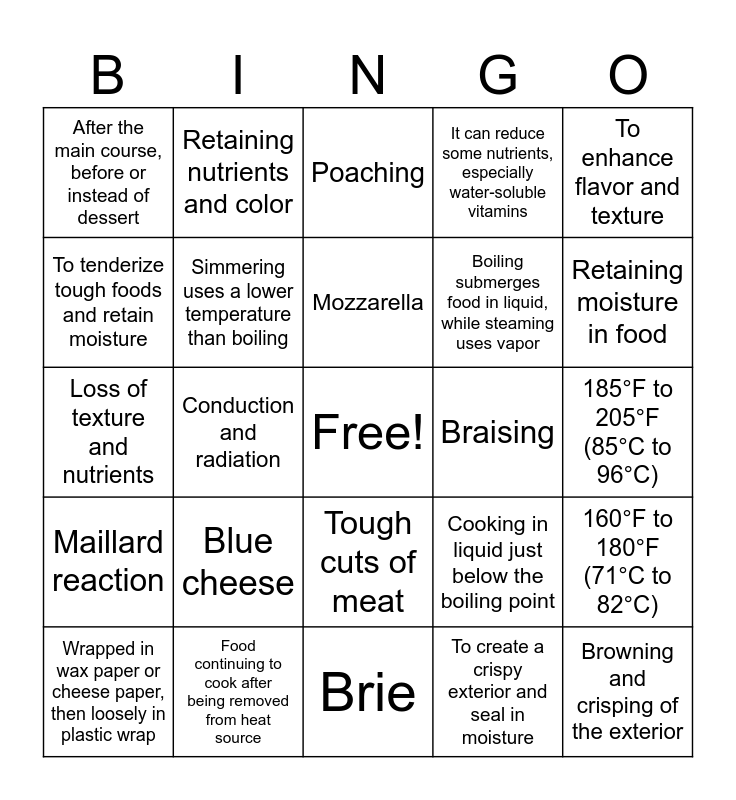 This bingo card has a free space and 25 words: Blue cheese, Brie, Mozzarella, Wrapped in wax paper or cheese paper, then loosely in plastic wrap, To enhance flavor and texture, After the main course, before or instead of dessert, To tenderize tough foods and retain moisture, Retaining nutrients and color, Braising, Tough cuts of meat, Boiling submerges food in liquid, while steaming uses vapor, Loss of texture and nutrients, Cooking in liquid just below the boiling point, 160°F to 180°F (71°C to 82°C), Simmering uses a lower temperature than boiling, Stewing, 185°F to 205°F (85°C to 96°C), Poaching, Retaining moisture in food, Conduction and radiation, Browning and crisping of the exterior, Food continuing to cook after being removed from heat source, Maillard reaction, It can reduce some nutrients, especially water-soluble vitamins and To create a crispy exterior and seal in moisture.