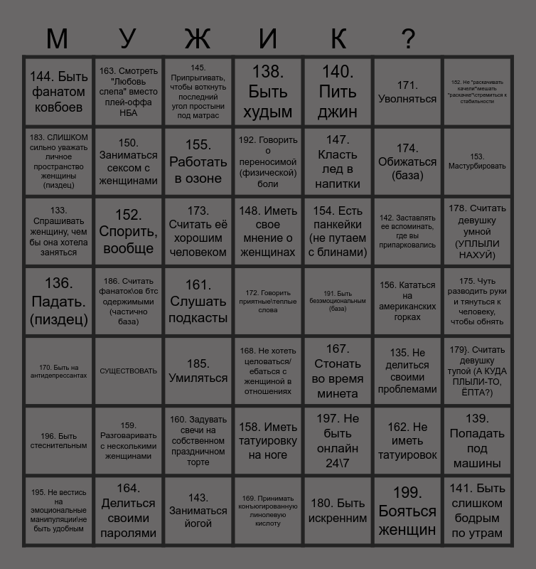 This bingo card has 69 words: СУЩЕТСВУЕШЬ, 133. Спрашивать женщину, чем бы она хотела заняться, 134. Делиться своими проблемами, 135. Не делиться своими проблемами, 136. Падать. (пиздец), 137. Ездить босиком, 138. Быть худым, 139. Попадать под машины, 140. Пить джин, 141. Быть слишком бодрым по утрам, 142. Заставлять ее вспоминать, где вы припарковались, 143. Заниматься йогой, 144. Быть фанатом ковбоев, 145. Припрыгивать, чтобы воткнуть последний угол простыни под матрас, 146. Поступать в колледж, особенно в технический, 147. Класть лед в напитки, 148. Иметь свое мнение о женщинах, 150. Заниматься сексом с женщинами, 151. Не иметь бороды, 152. Спорить, вообще, 153. Мастурбировать, 154. Есть панкейки (не путаем с блинами), 155. Работать в озоне, 156. Кататься на американских горках, СУЩЕСТВОВАТЬ, 158. Иметь татуировку на ноге, 159. Разговаривать с несколькими женщинами, 160. Задувать свечи на собственном праздничном торте, 161. Слушать подкасты, 162. Не иметь татуировок, 163. Смотреть "Любовь слепа" вместо плей-оффа НБА, 164. Делиться своими паролями, 165. Ходить в церковь, 166. Использовать электрическую зубную щетку, 167. Стонать во время минета, 168. Не хотеть целоваться/ебаться с женщиной в отношениях, 169. Принимать конъюгированную линолевую кислоту, 170. Быть на антидепрессантах, 171. Уволняться, 172. Говорить приятные\теплые слова, 173. Считать её хорошим человеком, 174. Обижаться (база), 175. Чуть разводить руки и тянуться к человеку, чтобы обнять, {176. Считать девушку красивой (ага), 177. Считать девушку некрасивой (приплыли блять), 178. Считать девушку умной (УПЛЫЛИ НАХУЙ), 179}. Считать девушку тупой (А КУДА ПЛЫЛИ-ТО, ЁПТА?), 180. Быть искренним, 181. Открываться (что равно быть жалким\тряпкой), 182. Не "раскачивать качели"\мешать "раскачке"\стремиться к стабильности, 183. СЛИШКОМ сильно уважать личное пространство женщины (пиздец), 184. Мыть голову чаще двух раз в неделю, 185. Умиляться, 186. Считать фанаток\ов бтс одержимыми (частично база), 187. Иметь диагностированную проблему с башкой, 188. Ходить к психотерапевту, 189. Быть старше 16-ти, и при этом девственником, 190. Волноваться за кого-либо, 191. Быть безэмоциональным (база), 192. Говорить о переносимой (физической) боли, 193. Иметь границы\принципы\мораль, 194. Бояться принимать душ в присутствии других мужчин, 195. Не вестись на эмоциональные манипуляции\не быть удобным, 196. Быть стеснительным, 197. Не быть онлайн 24\7, 198. Не плакать, 199. Бояться женщин, 200. Называть кого-то тюбиком and 201. С У Щ Е С Т В О В А Т Ь.