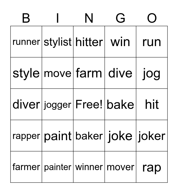 This bingo card has a free space and 24 words: paint, painter, farm, farmer, run, runner, style, stylist, bake, baker, dive, diver, joke, joker, move, mover, hit, hitter, jog, jogger, rap, rapper, win and winner.
