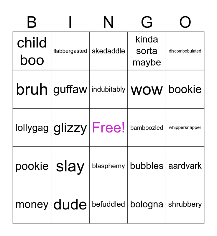 This bingo card has a free space and 24 words: slay, dude, indubitably, money, discombobulated, child boo, bruh, flabbergasted, bamboozled, blasphemy, wow, lollygag, bubbles, aardvark, guffaw, bologna, whippersnapper, skedaddle, bookie, glizzy, shrubbery, pookie, kinda sorta maybe and befuddled.