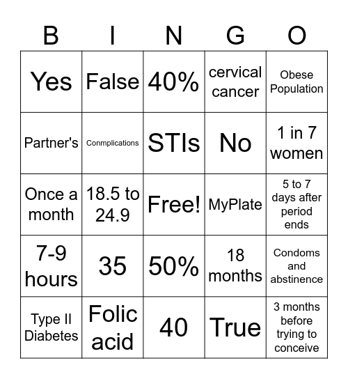This bingo card has a free space and 24 words: 35, Folic acid, STIs, Type II Diabetes, Obese Population, Yes, Partner's, False, MyPlate, 50%, No, Once a month, 18 months, Condoms and abstinence, Conmplications, True, 5 to 7 days after period ends, 40%, 1 in 7 women, 18.5 to 24.9, 3 months before trying to conceive, 7-9 hours, cervical cancer and 40.